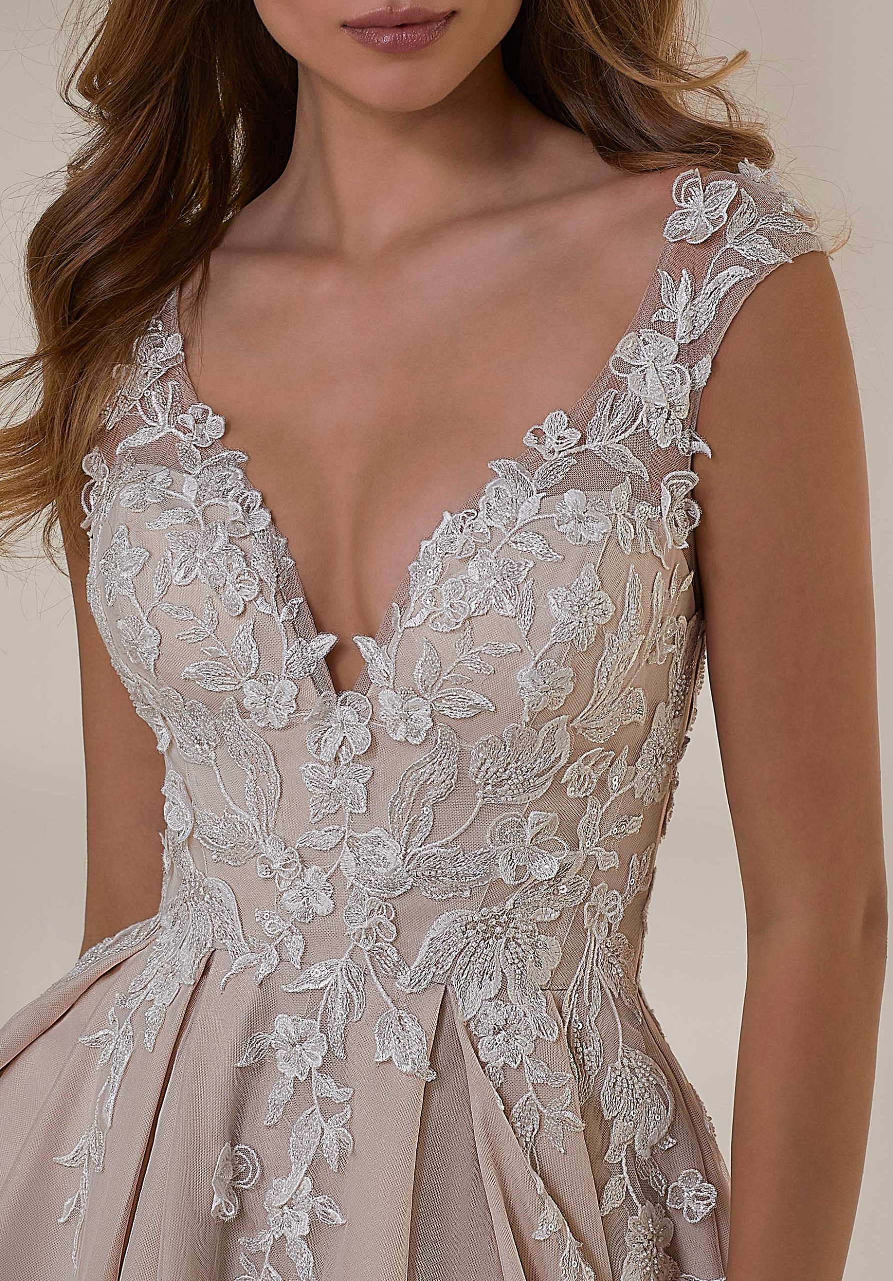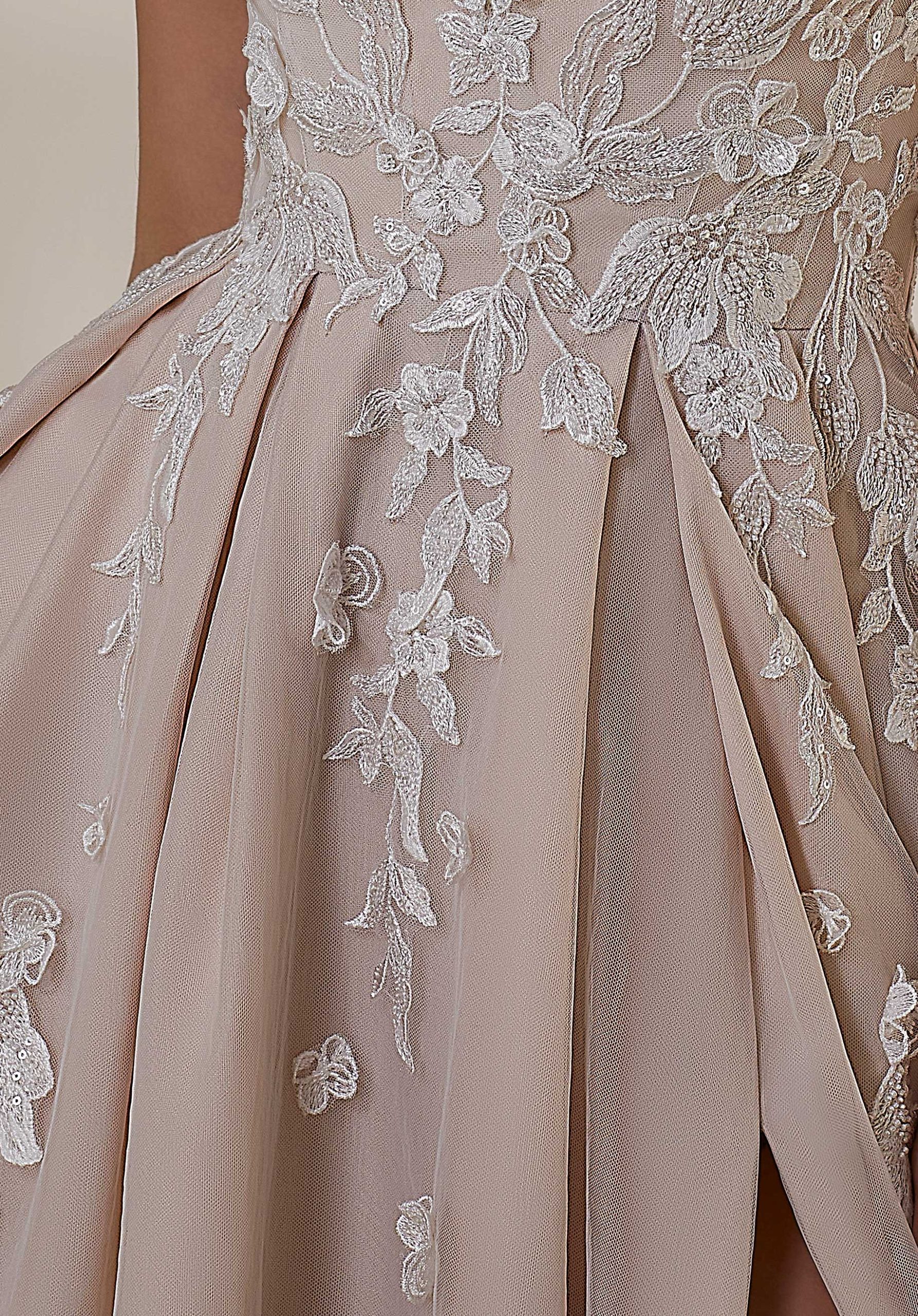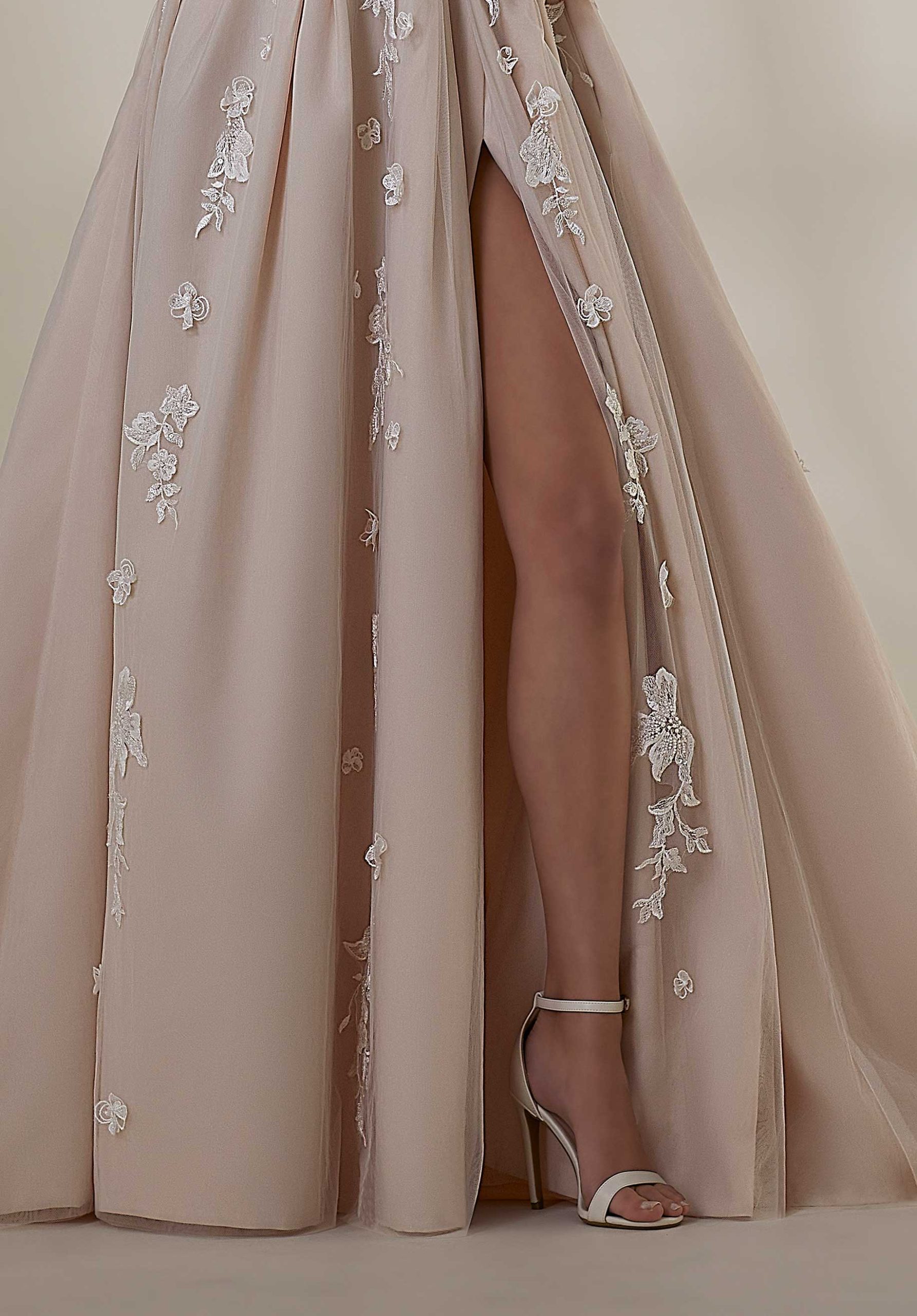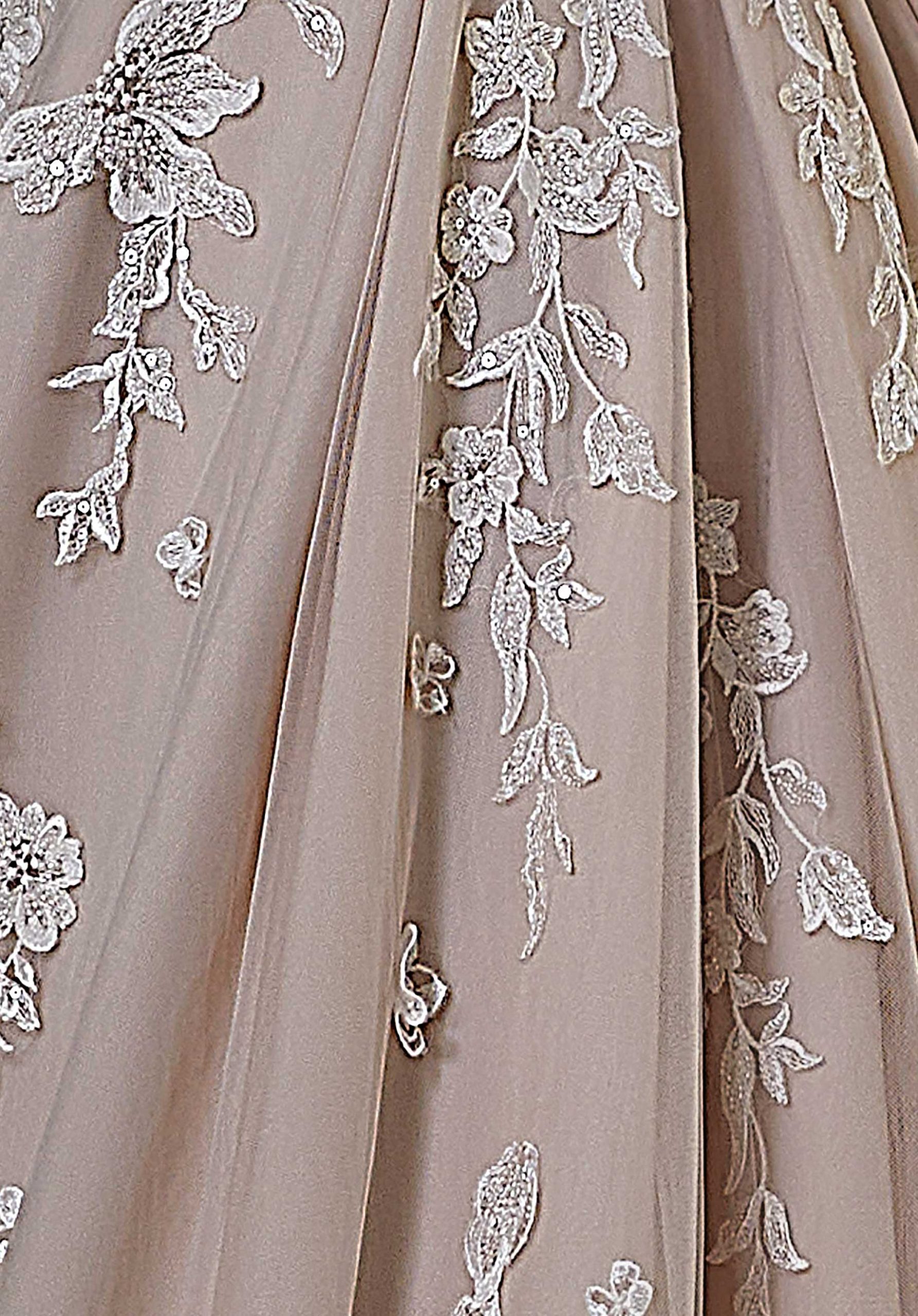 Crystal beaded three-dimensional floral lace gracefully floats down the dress.